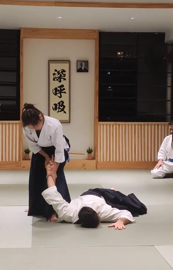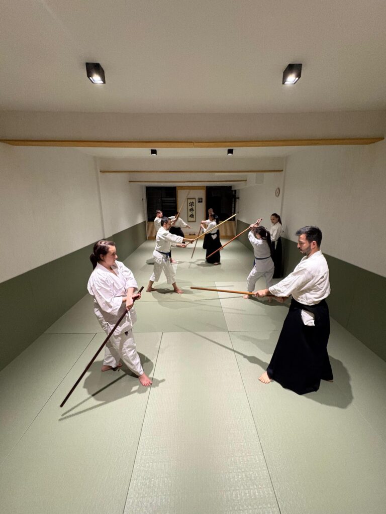 Na nossa escola, o estudo do Aikido contempla técnicas de combate corpo a corpo, além da espada de madeira (bokken) e o bastão (jo).